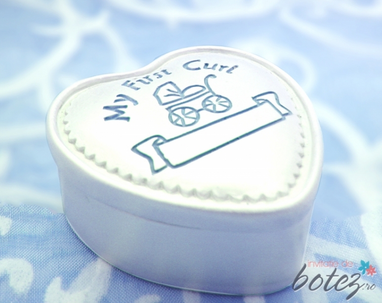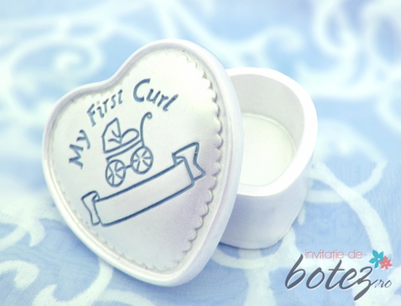 Cutiuta in forma de inimioara, confectionata din polirasina. Pe capacul cutiutei este ilustrat un carucior bleu si este inscriptionat textul "My First Curl".