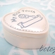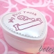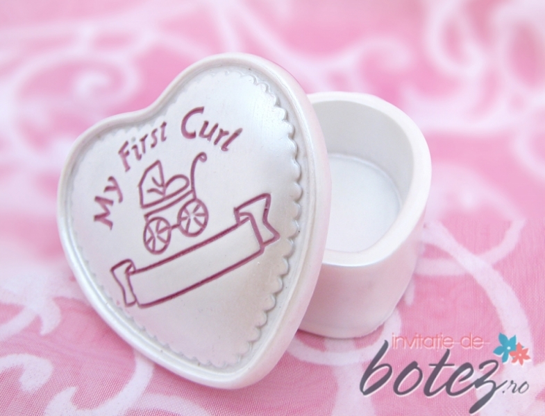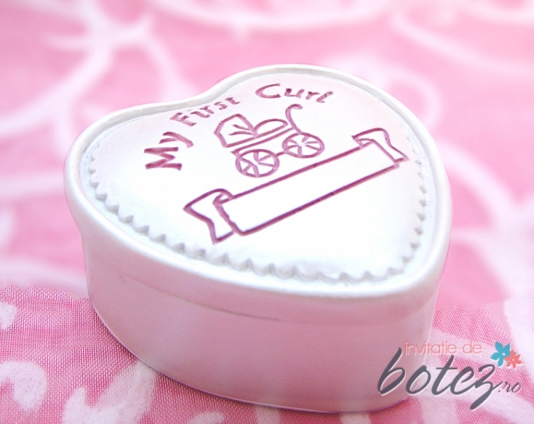 Cutiuta in forma de inimioara, confectionata din polirasina. Pe capacul cutiutei este ilustrat un carucior roz si este inscriptionat textul "My First Curl".