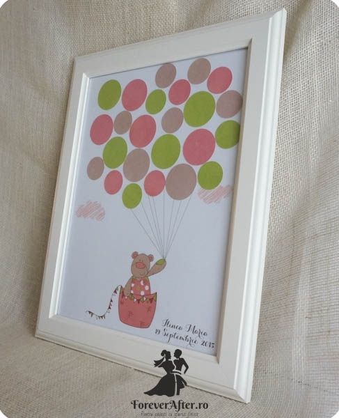 Guestbook pentru botez cu baloane colorate, invitatii bebelusului vostru vor lasa cate un mesaj sau o urare pentru bebelus. Mesajul va fi scris in unul din baloanele colorate tinute in mana de un urs simpatic. In partea din dreapta, jos este trecut numele bebelusului si data botezului.