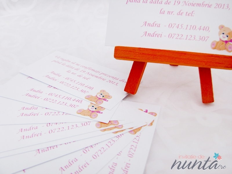 Card de confirmare ce va insoti invitatia dumneavoastra. Cardul este confectionat din carton alb, mat si are ilustrat un ursulet cu fundita roz. Va puteti alege orice font si orice culoare pentru tiparirea textului.
