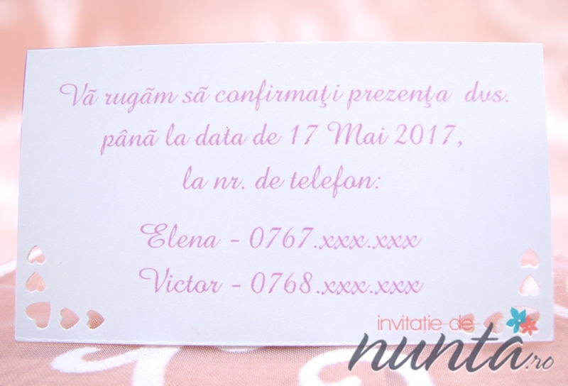 Card de confirmare ce va insoti invitatia dumneavoastra. Cardul este confectionat din carton alb, mat si are colturile perforate in forma de inimioare Va puteti alege orice font si orice culoare pentru tiparirea textului.