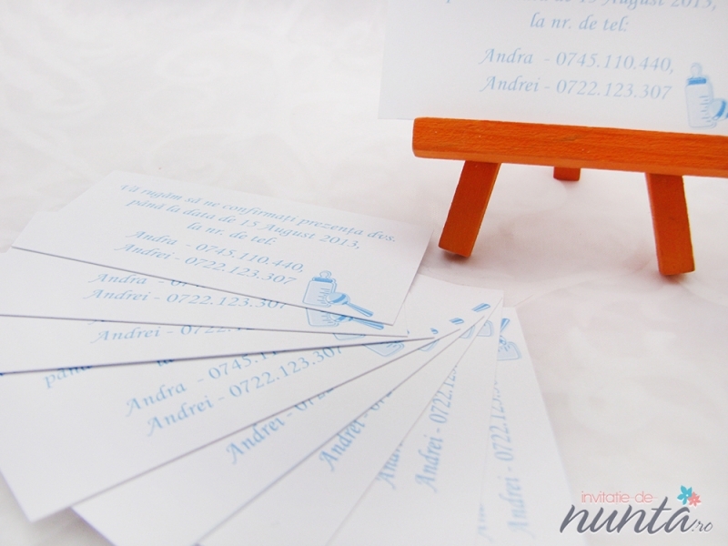 Card de confirmare ce va insoti invitatia dumneavoastra. Cardul este confectionat din carton alb, mat si are ilustrate un biberon si o jucarie de culoare albastra. Va puteti alege orice font si orice culoare pentru tiparirea textului.