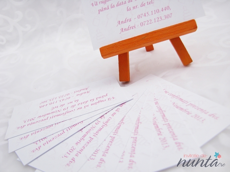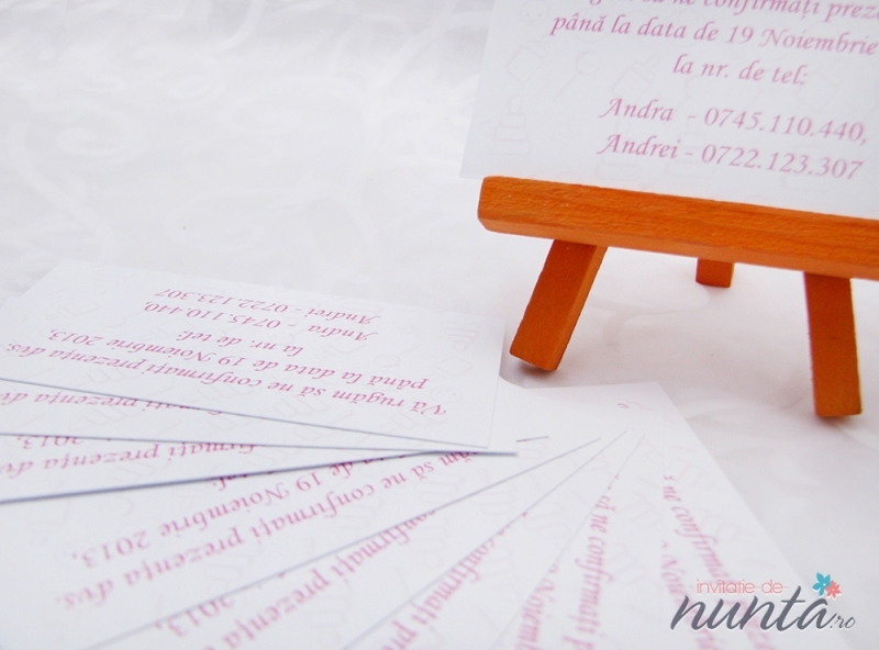 Card de confirmare ce va insoti invitatia dumneavoastra. Cardul este confectionat din carton alb, mat si are ca fundal numeroase jucarii conturate cu roz. Va puteti alege orice font si orice culoare pentru tiparirea textului.