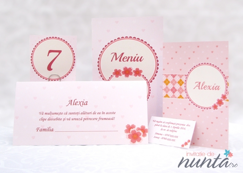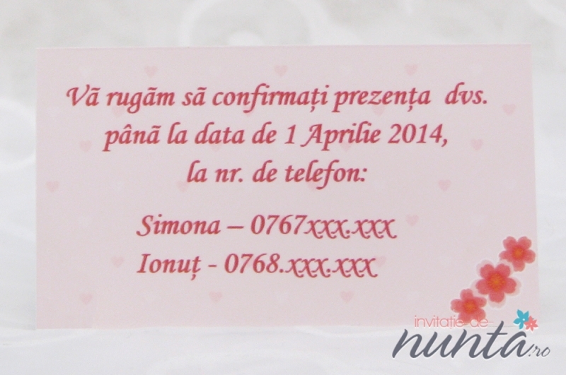 Card de confirmare ce va insoti invitatia dumneavoastra. Cardul este confectionat din carton roz, mat, cu inimioare si floricele. Va puteti alege orice font si orice culoare pentru tiparirea textului.