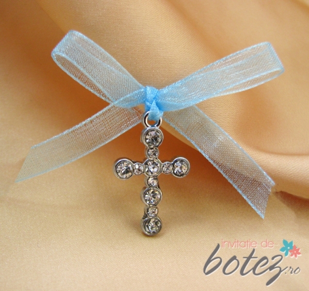 Cruciulita de botez stilizata, de culoare argintie, accesorizata cu un strasuri si fundita din panglica de organza bleu. Acest accesoriu de botez este potrivit pentru baietei.