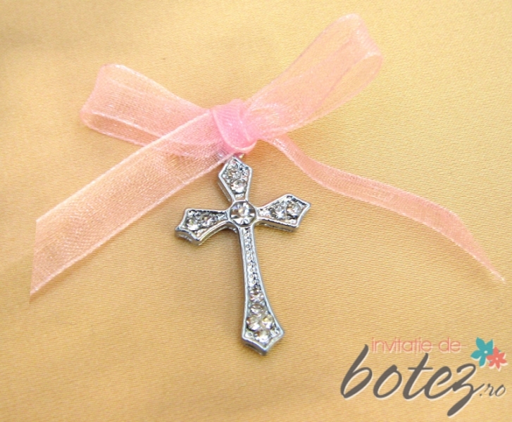 Cruciulita de botez stilizata, de culoare argintie, accesorizata cu strasuri si fundita din panglica de organza roz. Acest accesoriu de botez este potrivit pentru fetite.