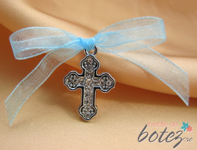 Cruciulita argintie stilizata cu strasuri si fundita bleu