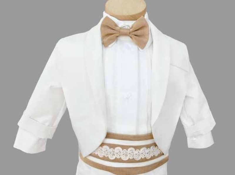 Costumas cu pantalonasi albi, camasa alb cu maro, papion maro si sacou alb.