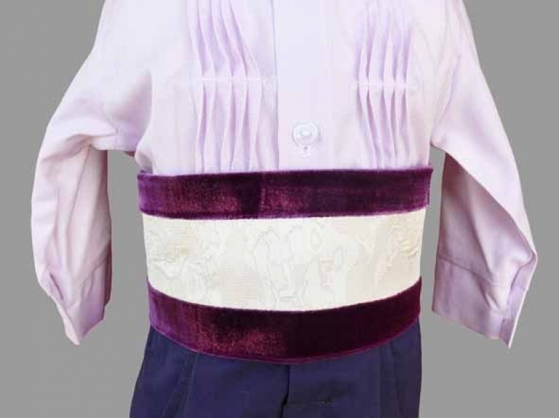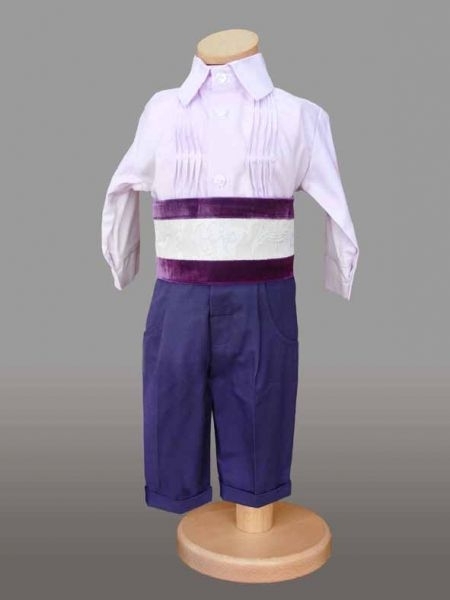 Costumasul are pantaloni albastri, camasuta si un brau din catifea mov cu crem.