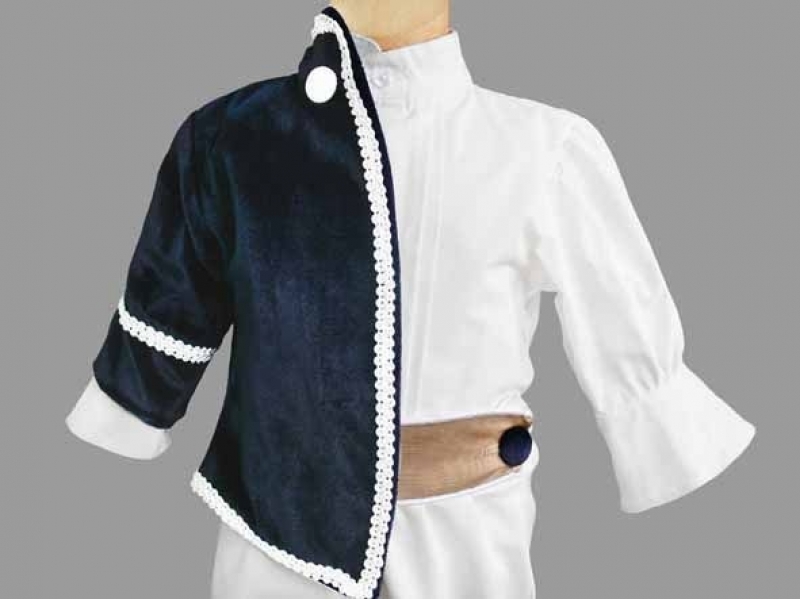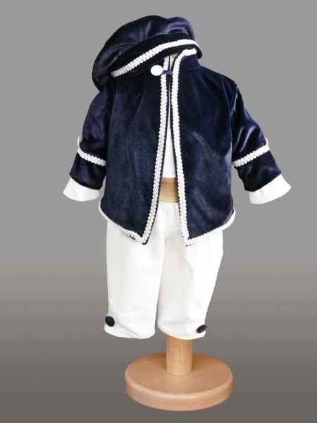 Costumas cu pantalonasi albi, camasa alba in dungi di sacou sacou din catifea bleumarin cu broderie.