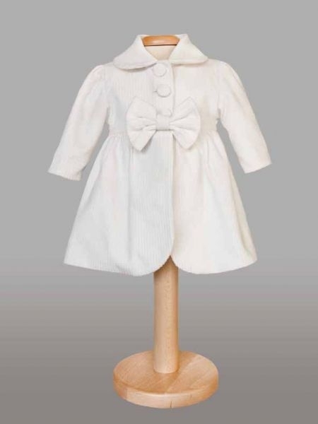 Paltonas de culoare crem, cu fundita si nasturei, potrivit pentru fetite de 3 sau 6 luni.