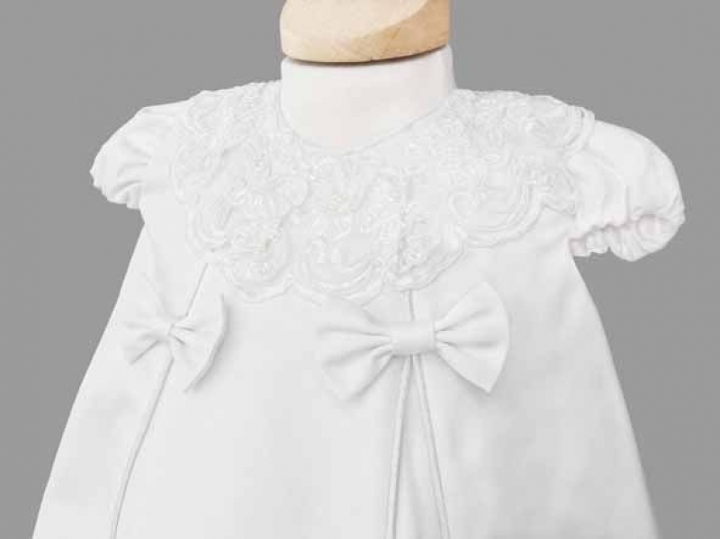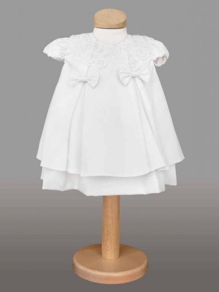 Rochita de culoare alba, cu guleras brodat, accesorizata cu doua fundite de aceeasi culoare.