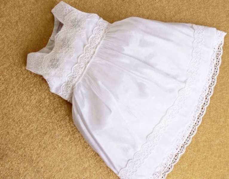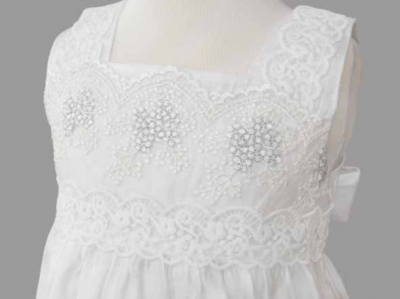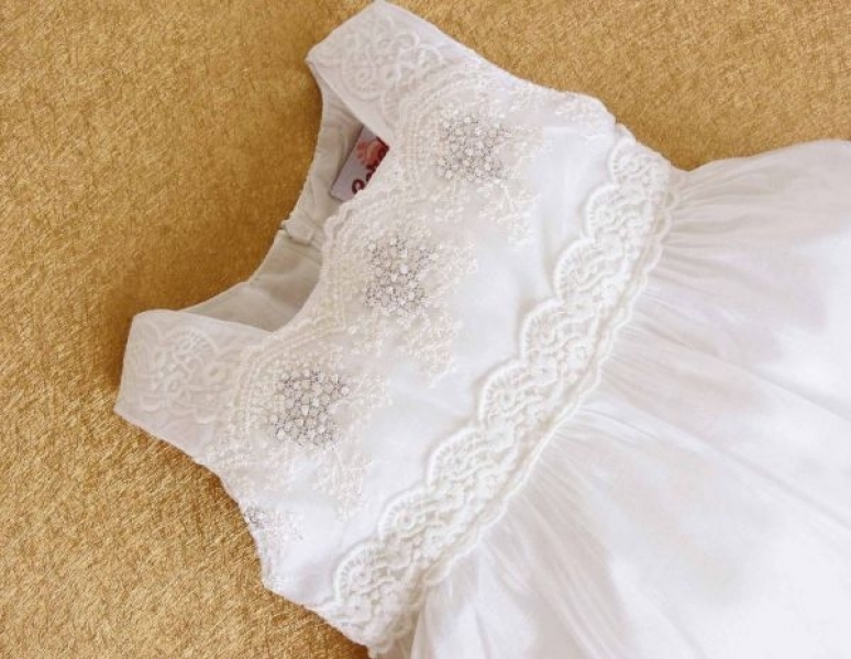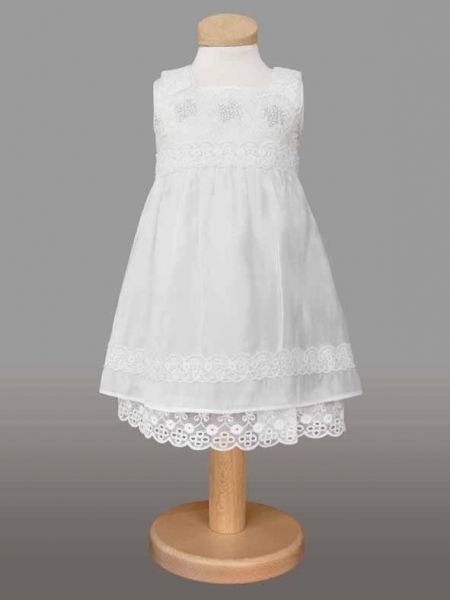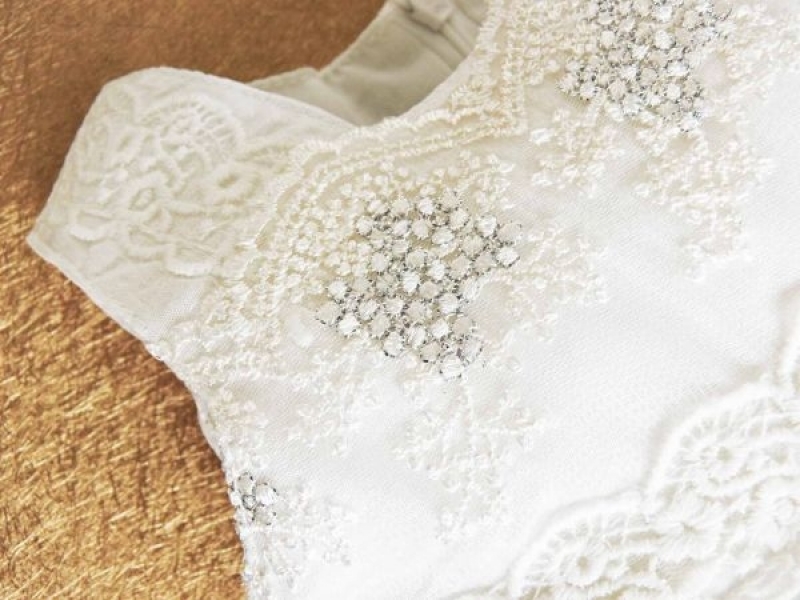 O rochita alba cu bretele late si broderie in parte de sus si de jos.