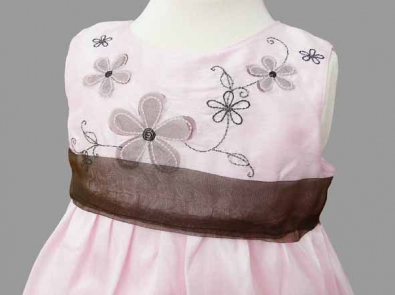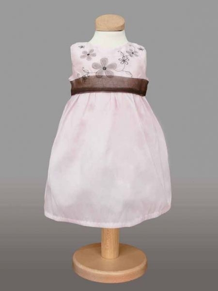 Rochita de culoare roz cu floricele si banda din tul maro.