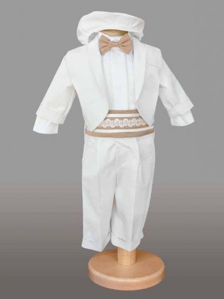 Costumas cu pantalonasi albi, camasa alb cu maro, papion maro, sacou alb si basca alba.
