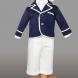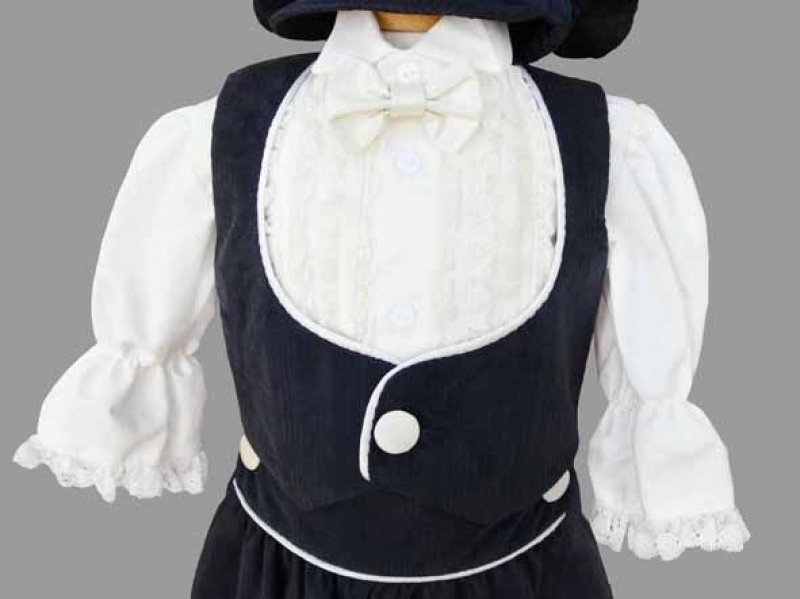 Costumas tip medieval, cu pantalonasi bleumarin, camasa alba, papion alb vesta, botosei si bereta bleumarin.