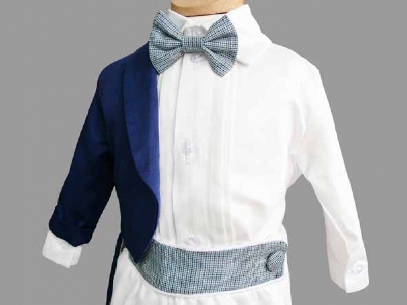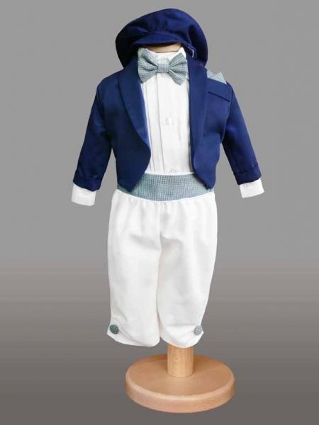 Costumas cu pantalonasi albi, camasa alba, sacou albastru, bereta albastra, papion si brau in carouri.