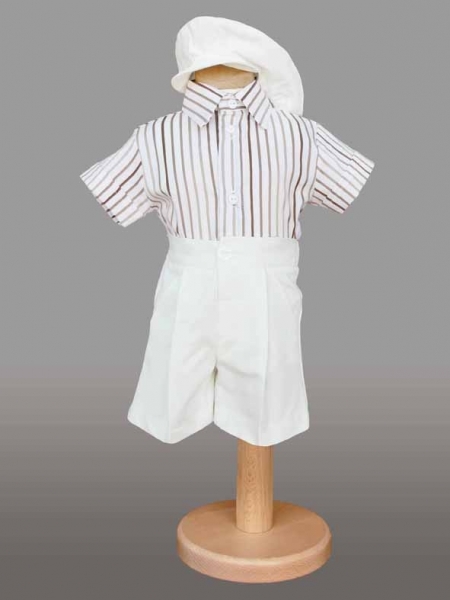 Set costumas pantaloni albi cu camasa in dungi si basca