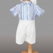 Setul contine costumasul cu pantalonasi albi si camasa cu maneca scurta, in dungi (bleu sau maro) si bascuta alba.