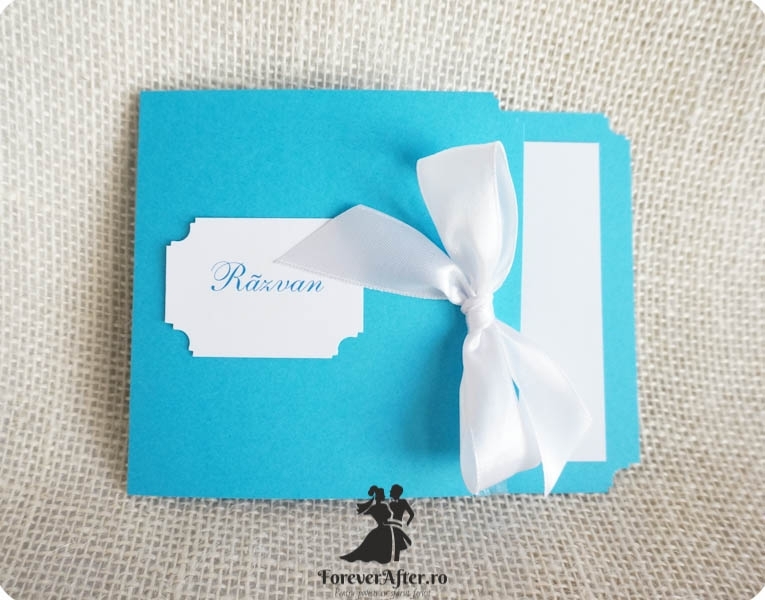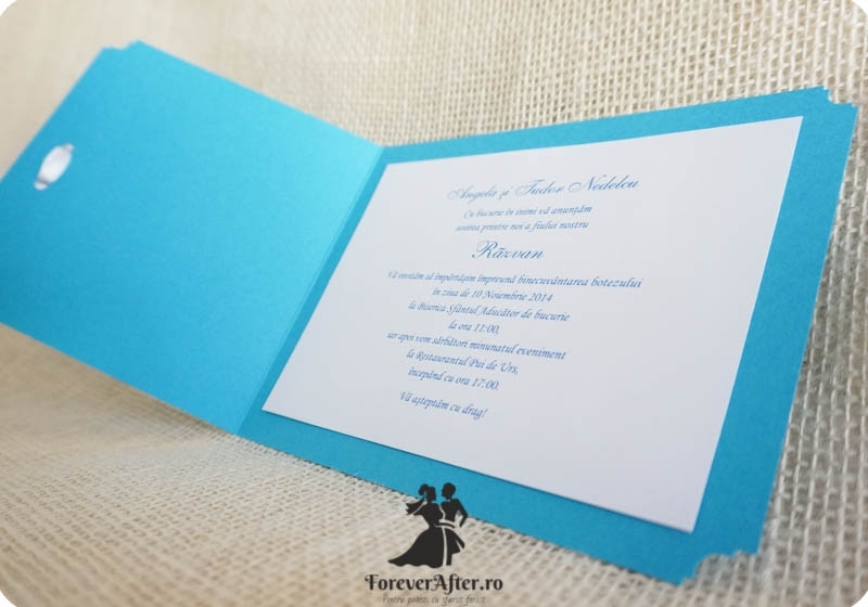 Invitatie de botez din carton bleu, cu chenar alb cu inimioare. In chenar este tiparit numele copilului, iar textul invitatiei se scrie in interior pe un carton alb. Invitatia se pliaza pe verticala si are atasasta o fundita alba din satin.