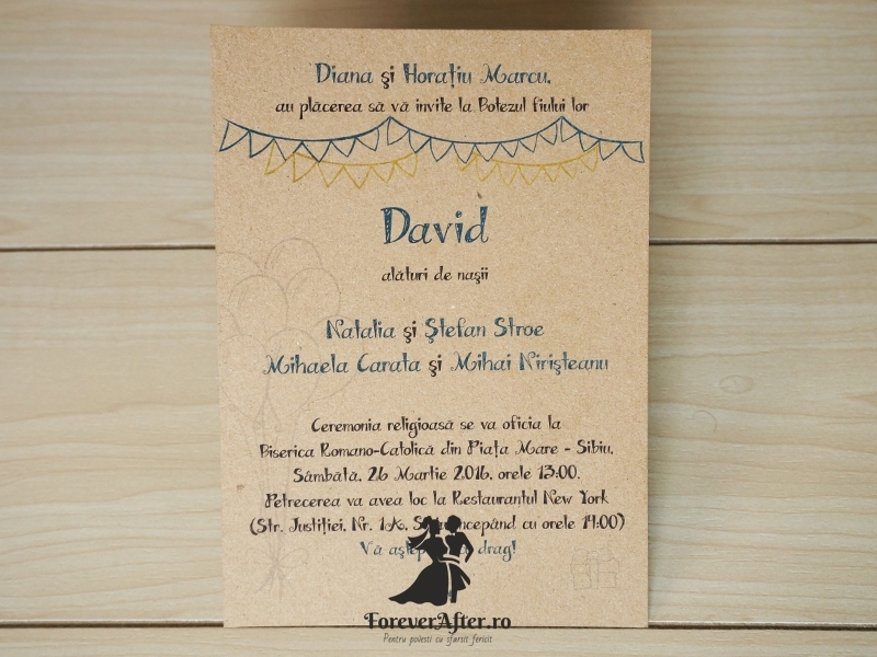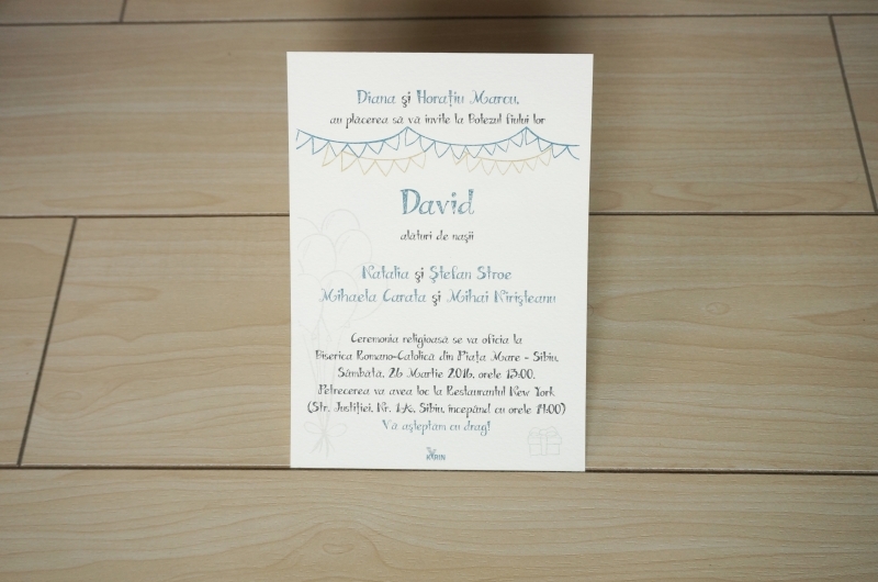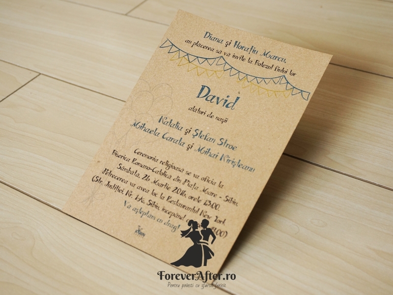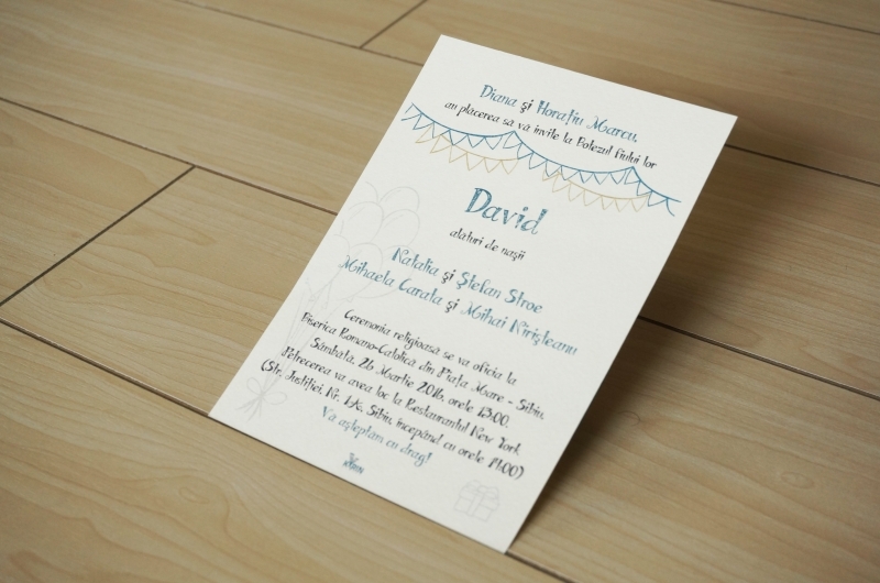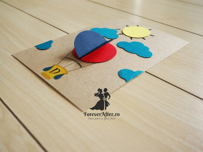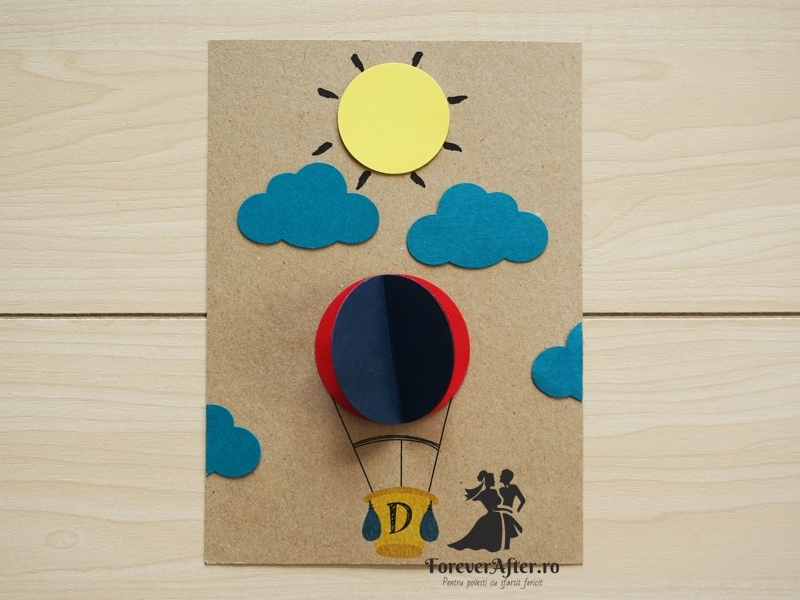 O creatie handmade unica iti va trimite invitatii intr-o spectaculoasa calatorie cu balonul pe care nu o vor uita niciodata. Vor petrece alaturi de tine si bebelusul tau printe norisori pufosi si raze calde de soare. Toate aceste detalii sunt reliefate pe un carton kraft sau, la cerere, pe carton crem texturat, iar textul este imprimat pe verso.
