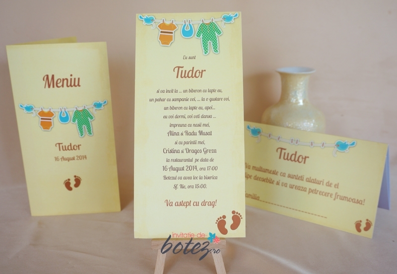 Invitatie de botez cu pasarele si hainute, este facuta din carton alb, mat, pe care este imprimat un fundal galben iar in partea de sus a invitatiei sunt atarnate de o ata hainute de bebelus tinute de doua pasarele. Invitatia este potrivita pentru botezul unui baietel.