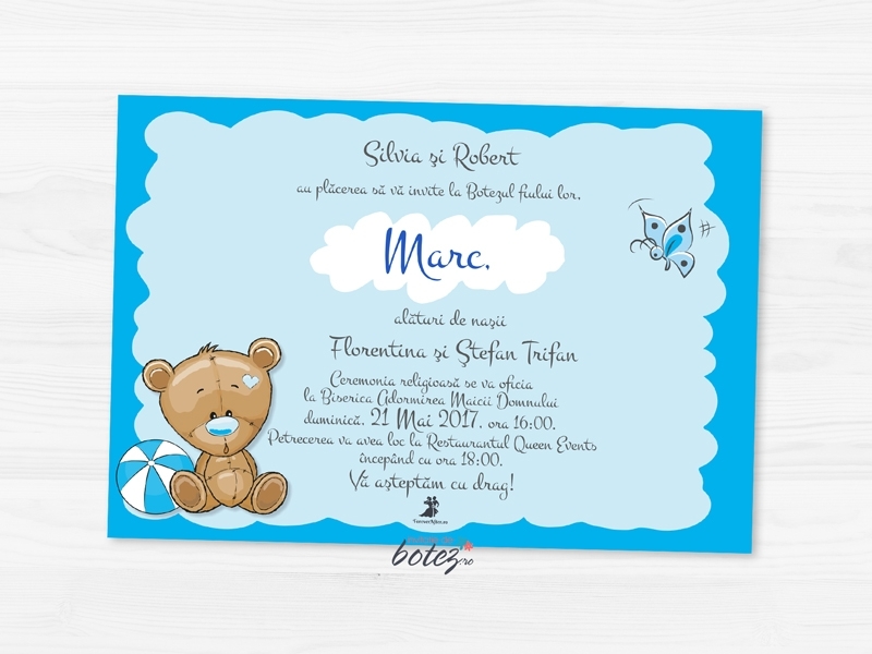 Invitatie de botez albastra cu carucior si ursulet. Invitatia se printeaza fata-verso si vine asamblata in plic alb.