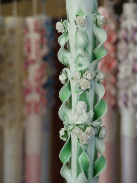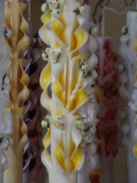 Lumanarea este sculptata la capatul superior si nu mai necesita aranjament floral.
