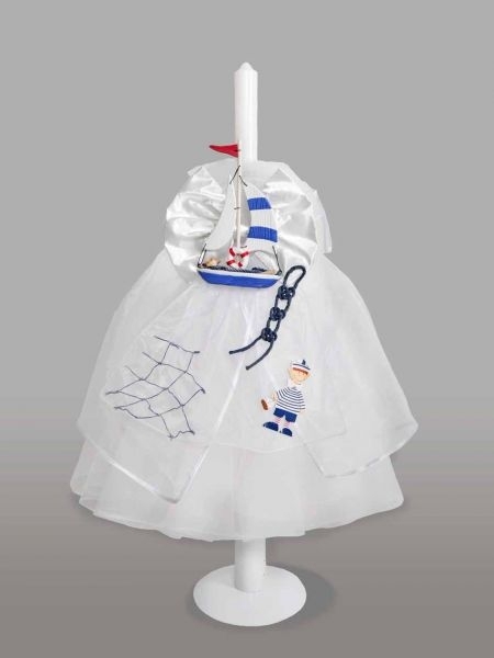 Lumanare de botez, imbracata in tul alb si accesorizata cu o figurina baietel marinar, barcuta si funda alba. Acest model este ideal pentru botezul baieteilor.