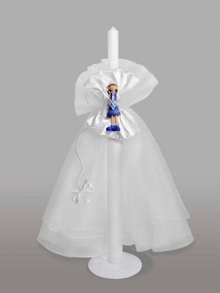Lumanare de botez, imbracata in tul alb si accesorizata cu o figurina fetita marinar si doua funde albe din satin. Acest model este ideal pentru botezul fetitelor.