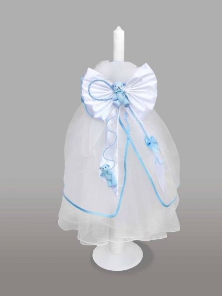 Lumanare de botez, imbracata in tul alb si accesorizata cu doi ursuleti bleu si o funda alba din satin. Acest model este ideal pentru botezul baieteilor.