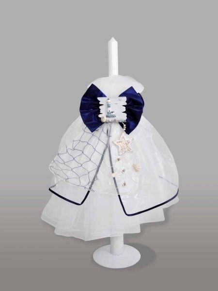 Lumanare de botez, imbracata in tul alb si accesorizata cu o figurina far, funda albastra din satin si scoici. Acest model este ideal pentru botezul baieteilor.