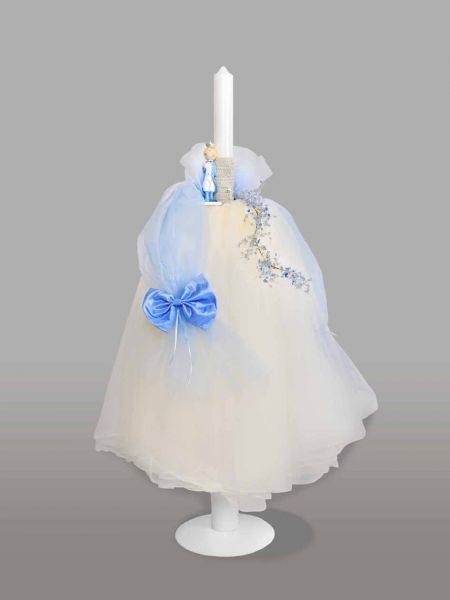 Lumanare de botez, imbracata in tul alb si bleu, accesorizata cu o figurina print si o fundita bleu, din satin. Acest model este ideal pentru botezul baieteilor.