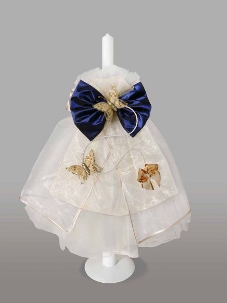 Lumanare de botez, imbracata in tul alb, accesorizata cu doi fluturasi aurii, o funda mare bleumarin din satin si una mica, aurie, din organza. Acest model este ideal pentru botezul baieteilor.
