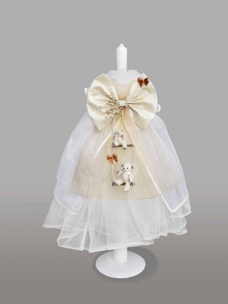 Lumanare de botez, imbracata in tul alb si crem, accesorizata cu doi ursuleti in leagan si o fundita crem din satin. Acest model este ideal atat pentru botezul baieteilor cat si pentru botezul fetitelor.