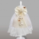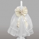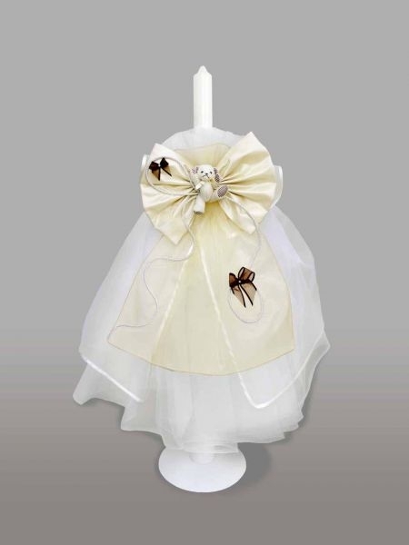 Lumanare de botez, imbracata in tul alb si crem, accesorizata cu un ursulet crem, o funda mare, de culoare crem, din satin si doua fundite mici din organza maro. Acest model este ideal atat pentru botezul baieteilor cat si pentru botezul fetitelor.