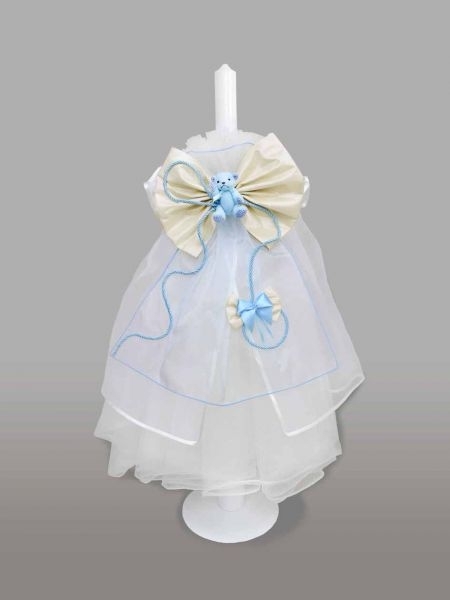 Lumanare de botez, imbracata in tul alb si accesorizata cu un ursulet bleu, o funda mare crem si o funda mica bleu cu crem, din satin. Acest model este ideal pentru botezul baieteilor.