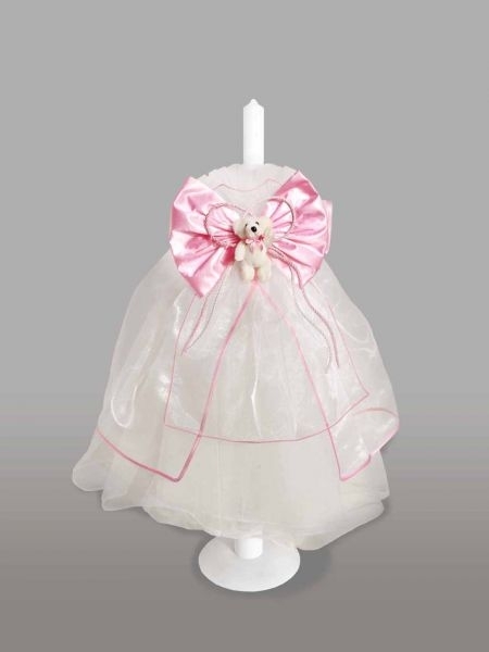 Lumanare de botez, imbracata in tul alb, accesorizata cu un ursulet si o funda roz din satin. Acest model este ideal pentru botezul fetitelor.