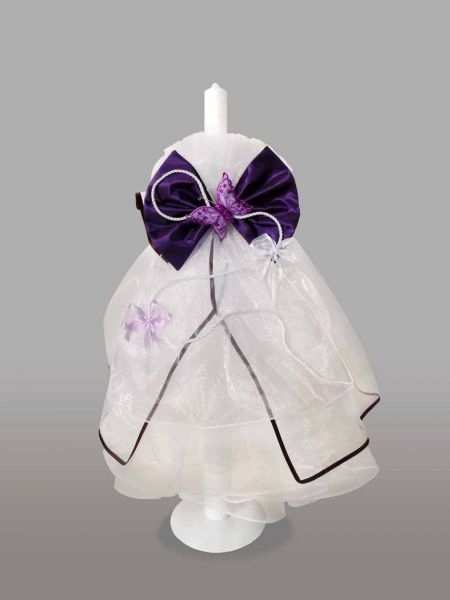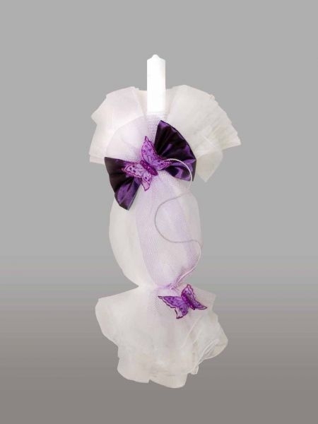 Lumanare de botez, imbracata in tul alb, accesorizata cu fluturas si funda mov din satin. Acest model este ideal atat pentru botezul baieteilor, cat si pentru botezul fetitelor.