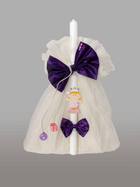 Lumanare de botez, imbracata in tul alb, accesorizata cu figurina fetita printesa si doua funde mov din satin. Acest model este ideal pentru botezul baieteilor.