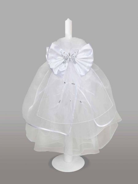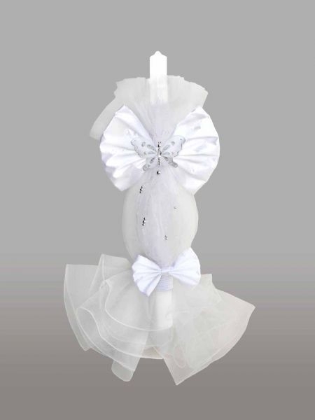 Lumanare de botez, imbracata in tul alb, accesorizata cu fluturas si funda alba din satin. Acest model este ideal atat pentru botezul fetitelor, cat si pentru botezul baieteilor.