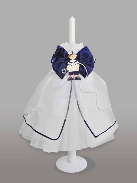 Lumanare de botez, imbracata in tul alb si accesorizata cu o figurina baietel marinar si o funda albastra. Acest model este ideal pentru botezul baieteilor.