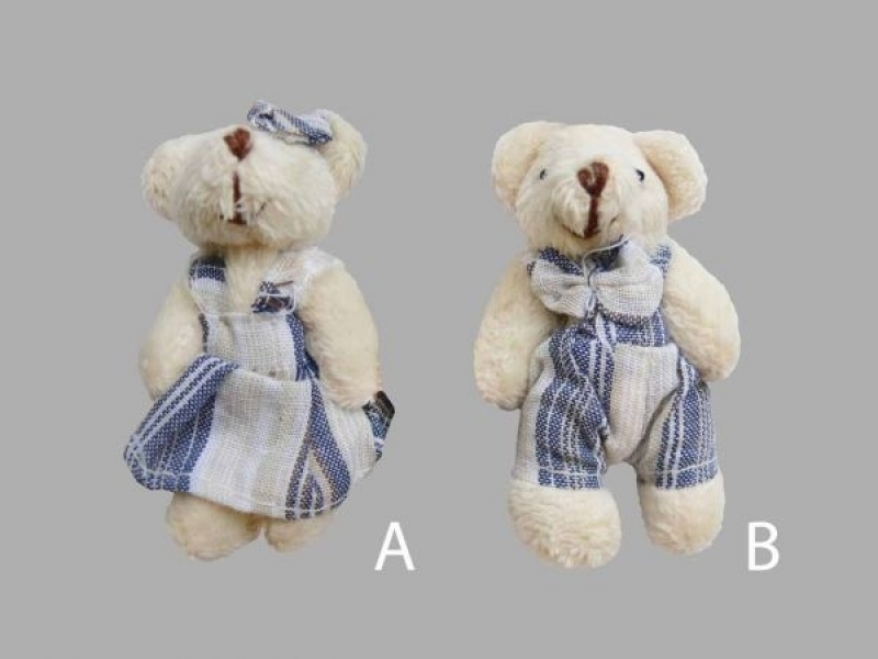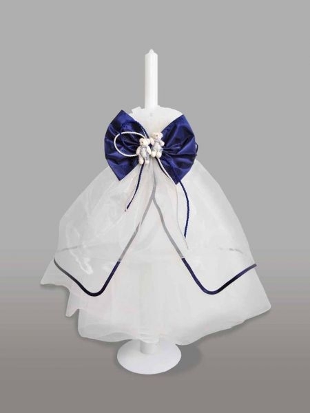 Lumanare de botez, imbracata in tul alb si accesorizata cu doi ursuleti imbracati in albastru si o funda bleumarin din satin. Acest model este ideal atat pentru botezul baieteilor cat si pentru botezul fetitelor, avand optiunea de a alege daca ursuletii sunt imbracati in salopeta sau in rochita.