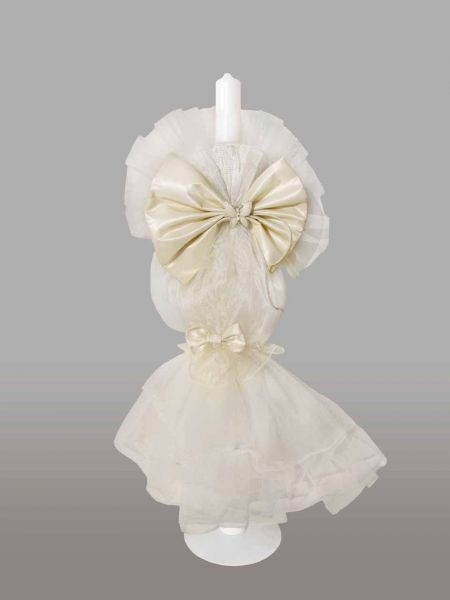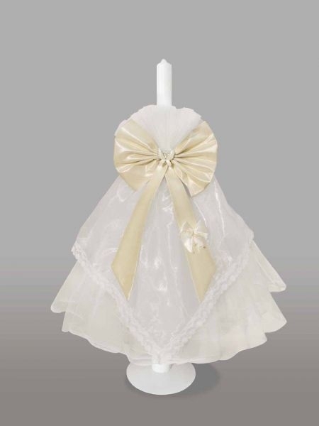 Lumanare de botez, imbracata in tul alb si accesorizata cu fluturas si funda crem din satin. Acest model este ideal atat pentru botezul fetitelor, cat si pentru botezul baieteilor.