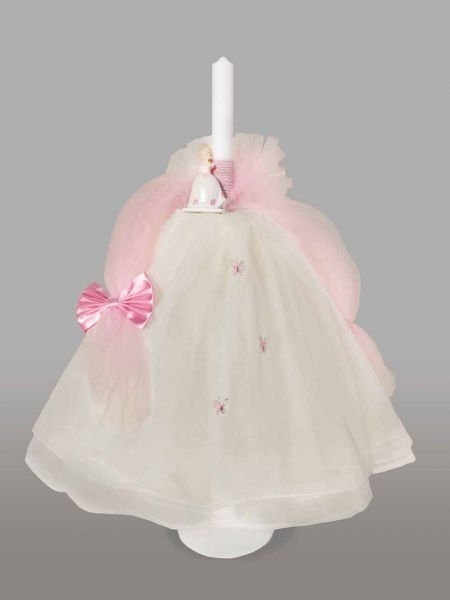 Lumanare de botez, imbracata in tul alb si roz, accesorizata cu o figurina printesa si o fundita roz din satin. Acest model este ideal pentru botezul fetitelor.