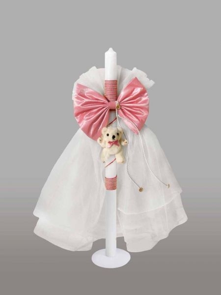 Lumanare de botez, imbracata in tul alb, cu snur roz, accesorizata cu un ursulet si o funda roz. Acest model este ideal pentru botezul fetitelor.