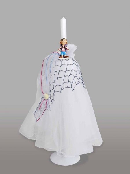 Lumanare de botez, imbracata in tul alb si accesorizata cu o figurina baietel pirat si plasa. Acest model este ideal pentru botezul baieteilor.