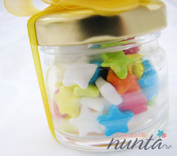 Marturie borcanas cu bomboane si funda galbena
