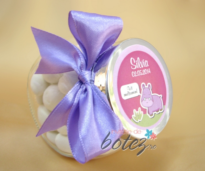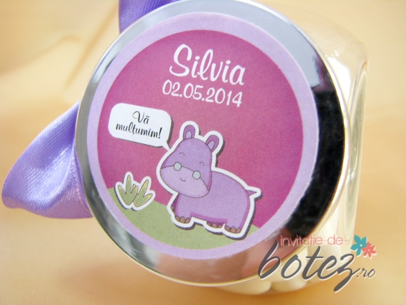 Marturie de botez borcanas cu bomboane, accesorizat cu o fundita satinata de culoare lila. Capacul este roz si are ilustrat un hipopotam haios si se poate personaliza cu numele copilului si data botezului.