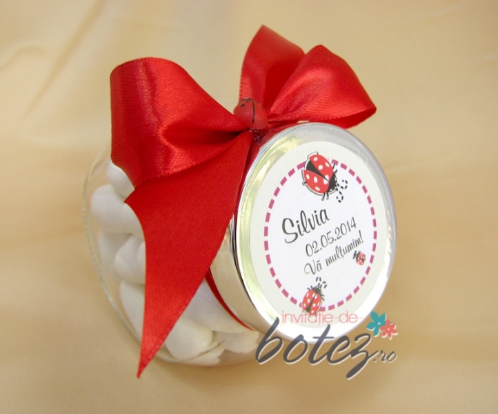 Marturie de botez borcanas cu bomboane, accesorizat cu o fundita satinata de culoare rosie si buburuza. Capacul are ilustrate buburuze rosii si se poate personaliza cu numele copilului si data botezului.